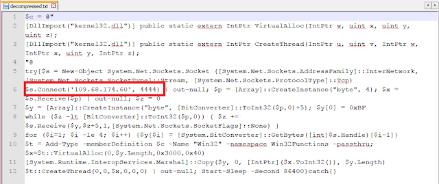 我現在可以打開 decompressed.txt 也就是我們剛剛解壓縮出來的內容,裡面是純 PowerShell 腳本,這邊我們又可以看到一組 IP: