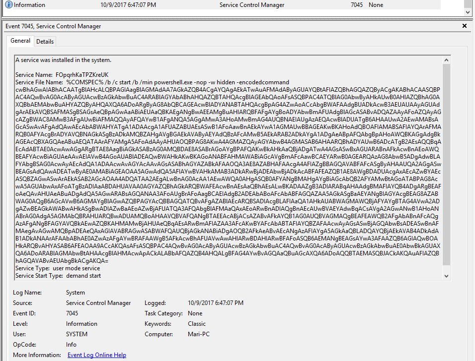 我在系統事件紀錄檔裡面找到了 PowerShell 腳本被當作服務安裝在系統上。 怎麼找到這些呢? 第一步就是尋找事件辨識碼 (Event ID) 7045. 當系統安裝服務時會有此事件紀錄,如下方圖片範例: