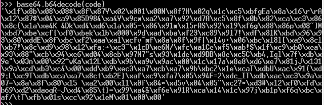 反向思考一下,這個資料應該是被壓縮並用 Base64 編碼,我們利用 Python 解碼後存成一個檔案並且去試著解壓縮 :