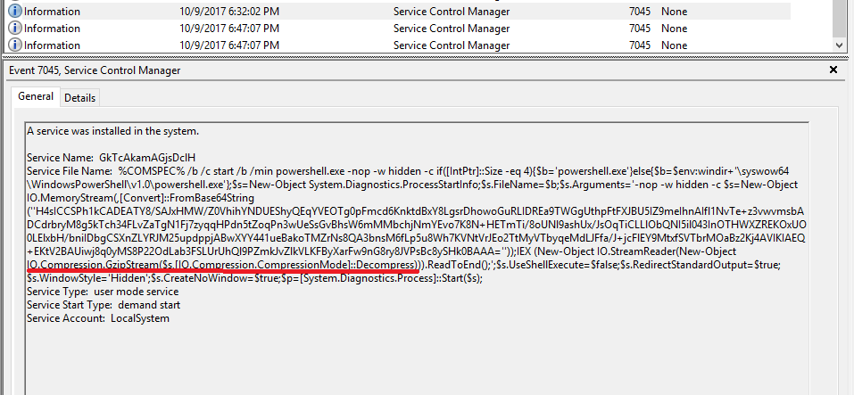 - 找看看系統事件 ID 為 7045 內容包括 “%COMSPEC%, powershell.exe, -encodedcommand, -w hidden , “From Base64String” 這類訊息的內容