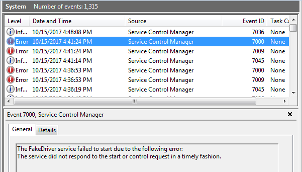 下方是兩個相應的系統事件辨識碼 7000 和 7009(如下圖)。 雖然 7009 顯示”The FakeDriver service failed to start..”,但不真的代表指令中的 binpath 執行失敗了。 請注意!不要將這樣的錯誤訊息認為是 PowerShell 並沒有成功執行。